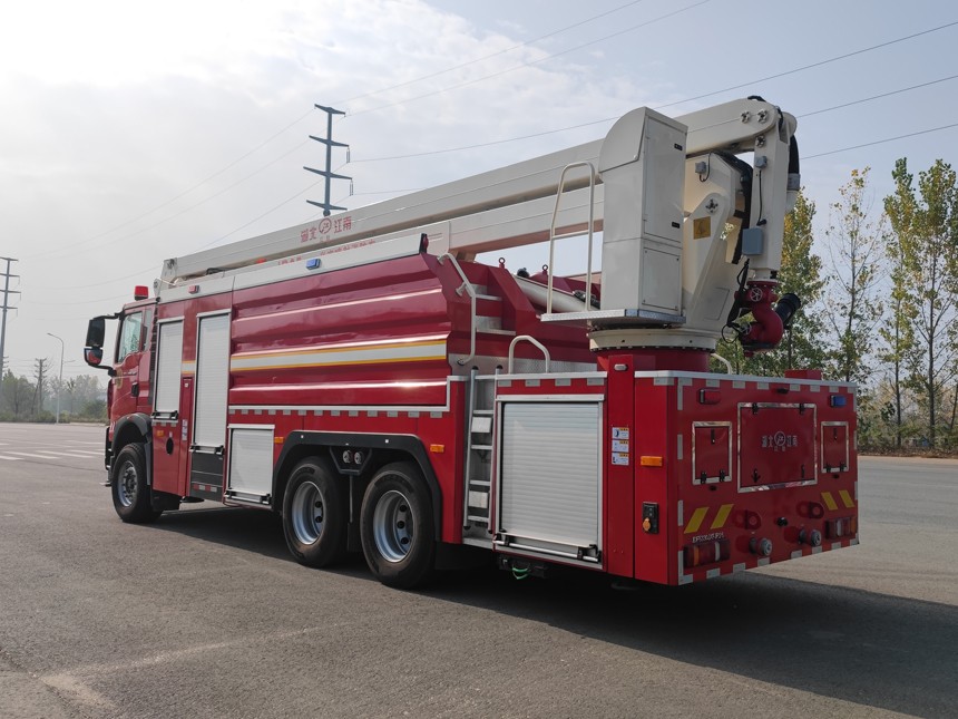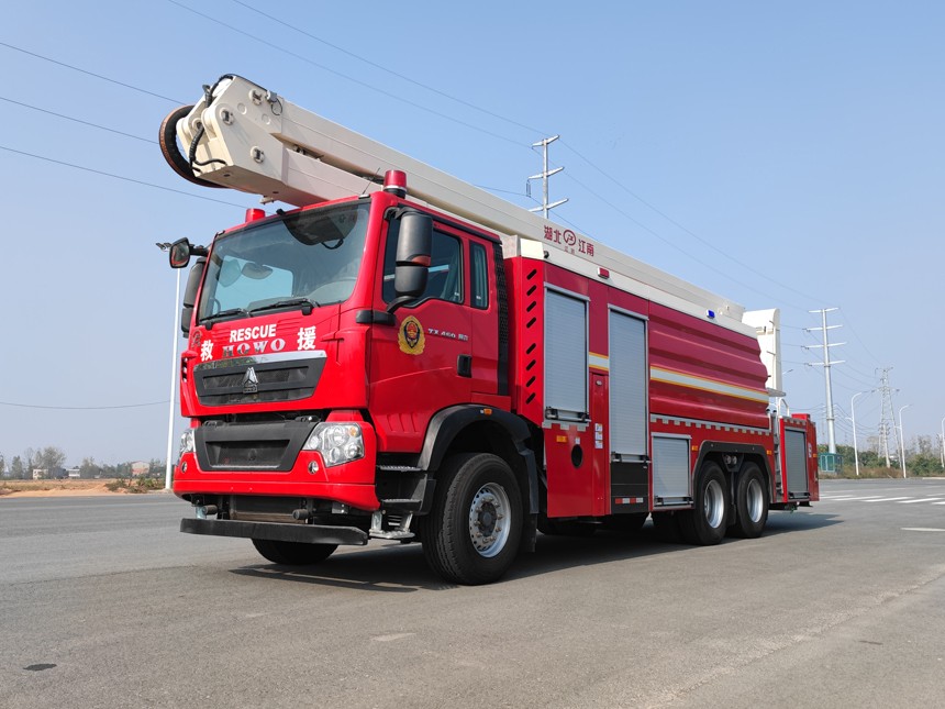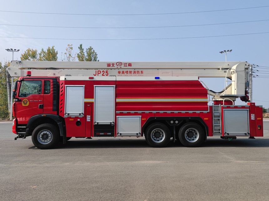 25米舉高噴射消防車采用重汽國六底盤,電液比例控制技術,整車在結構上分為上車和下車兩部分組成,上車和下車以回轉支承、中心回轉體為連接,通過液電控制系統將其緊密連成一體。下車主要由底盤、副 車架及支腿、走臺板及器材箱總成;下車消防系統、罐體結構、取力系統等部分組成。上車主要有轉臺、臂架、上車消防水路、操作平臺等部分。整車由底盤側取力器驅動高壓泵為液壓系統提供動力,電氣系統與氣路系統配合實現取力操縱和油門控制,整車的安全保護措施由電氣系統實現,并采用進口電氣元件,使其產品的實用性、穩定性和安全可靠性達到國內同類產品先進水平。該車主要針對轄區內大跨度廠房火災、中高層小區、居民樓建筑火災、油罐類火災等滅火作戰任務。廣泛適用于消防隊、石油化工、廠礦企業、 港口、碼頭等部門,可迅速接近火場展開滅火戰斗,撲救各種火災,是理想的消防裝備。 |
